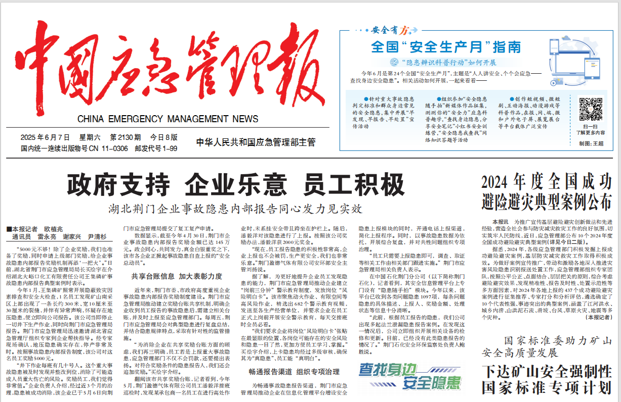 省應急管理廳組織中國應急管理報、人民網(wǎng)、湖北日報、湖北電視臺、極目新聞等省內主流媒體開展“安全生產楚天行”活動,結合“安全生產月”重點活動主題,就“安全吹哨人”(含公眾隱患舉報獎勵、企業(yè)內部隱患報告)制度落實典型單位開展宣傳報道。中國應急管理報頭版頭條、湖北日報大幅版面對湖北案例予以報道。安全月期間,省應急管理廳還將組織媒體采訪團集中采訪報道省安委會掛牌督辦重大隱患排查整治工作推進情況。