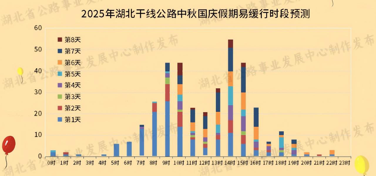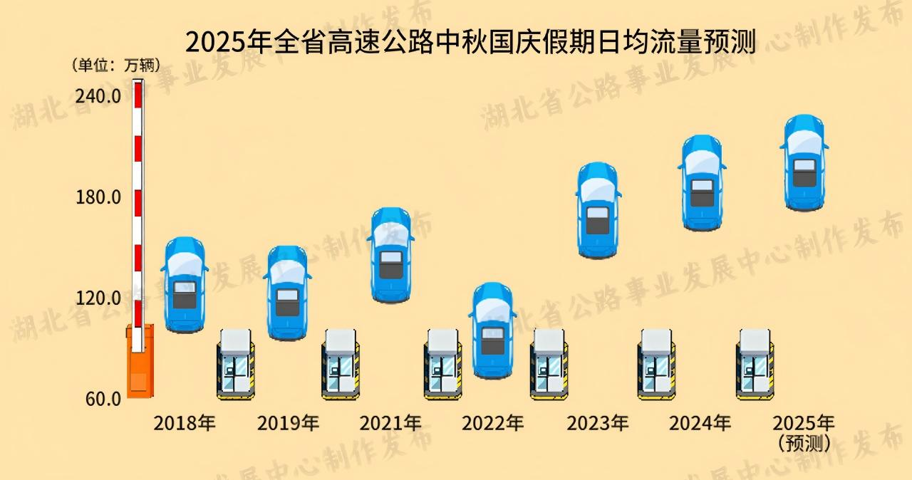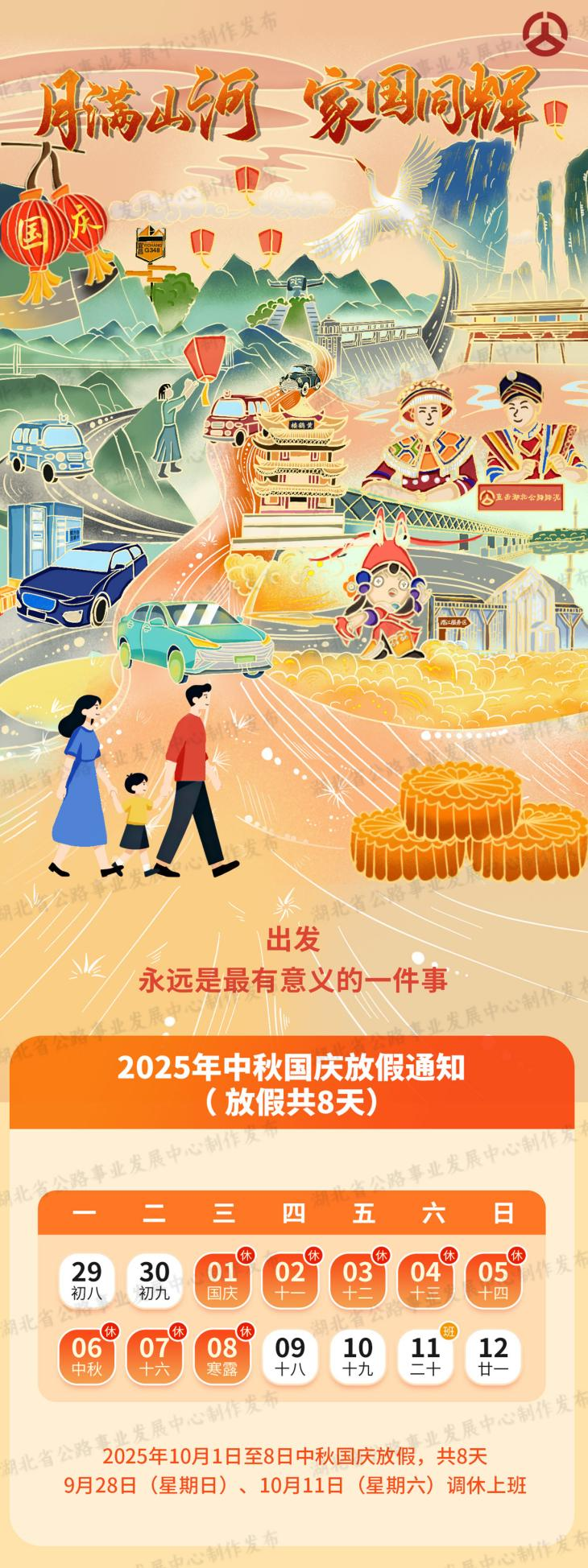2025年中秋國(guó)慶假期即將到來(lái),放假時(shí)間為10月1日至10月8日。根據(jù)國(guó)務(wù)院發(fā)布的《關(guān)于批轉(zhuǎn)交通運(yùn)輸部等部門重大節(jié)假日免收小型客車通行費(fèi)實(shí)施方案的通知》,中秋國(guó)慶假期期間,收費(fèi)公路對(duì)7座及以下小型客車免費(fèi)通行,免費(fèi)時(shí)間段為10月1日0時(shí)至10月8日24時(shí),共計(jì)八天。湖北省公路事業(yè)發(fā)展中心根據(jù)歷年來(lái)中秋國(guó)慶假期全省公路網(wǎng)運(yùn)行監(jiān)測(cè)情況分析,預(yù)計(jì)今年中秋國(guó)慶期間路網(wǎng)流量較平日大幅增長(zhǎng),社會(huì)公眾探親訪友、度假旅游等中短途出行需求將會(huì)集中釋放,省內(nèi)各市州周邊路段和通往省內(nèi)知名景區(qū)路段的交通流量將出現(xiàn)明顯增幅,省內(nèi)國(guó)高網(wǎng)、國(guó)省干線、武漢市周邊路段易出現(xiàn)不同程度的擁堵緩行?,F(xiàn)編制《2025年中秋國(guó)慶假期湖北省干線公路出行指南》,為公眾平安便捷出行提供參考。