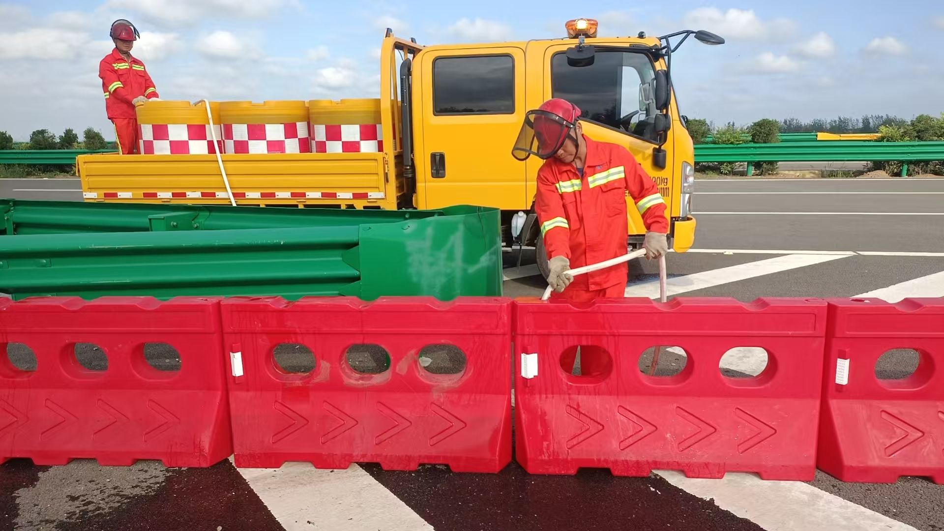 圖:漢孝向K291+487三角端擺放警示提醒的水馬并進行應急注水