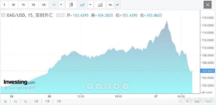 美東時間26日,貴金屬市場上演巨震,現(xiàn)貨白銀轉(zhuǎn)跌,報約102.8美元/盎司,此前日內(nèi)漲幅一度高達14%,最高觸及117美元/盎司。但在美股收盤后不久,現(xiàn)貨白銀幾乎回吐了當(dāng)天全部漲幅,隨后僅出現(xiàn)非常有限的反彈,當(dāng)日最終漲幅不到1%。